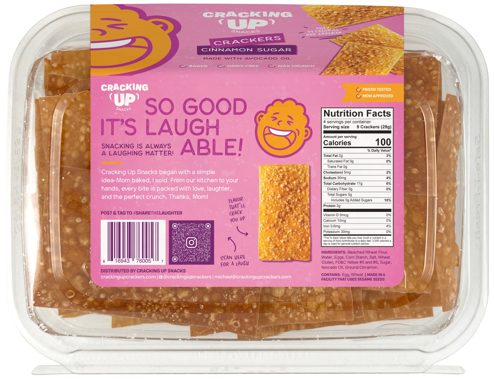 Ingredients: Crackers (Wheat flour, water, eggs , corn starch, salt, wheat, gluten, ascorbic acid, citric acid, potassium, sorbate [preservative]), brown sugar, avocado oil, organic cinnamon.