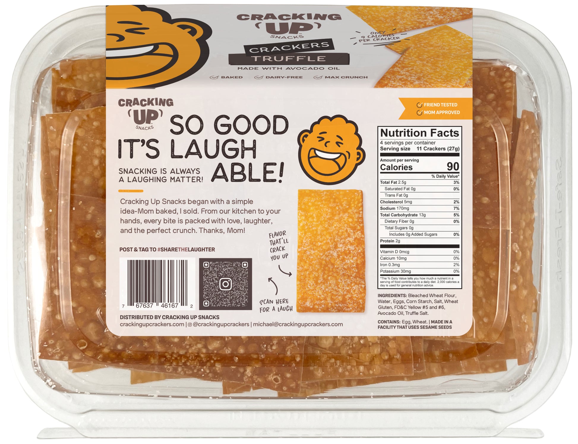 Ingredients: Crackers (Wheat flour, water, eggs, corn starch, salt, wheat gluten, ascorbic acid, citric acid, potassium sorbate, avocado oil, truffle salt, himalayan pink salt
